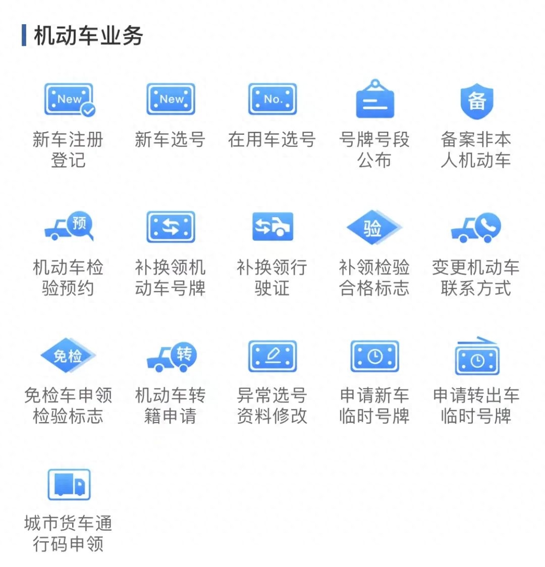 预选车牌号码、备案非本人机动车、检验预约、城市货车通行码申领、申请新车临时号牌、补换领行驶证、机动车联系方式变更、机动车转籍申请等。