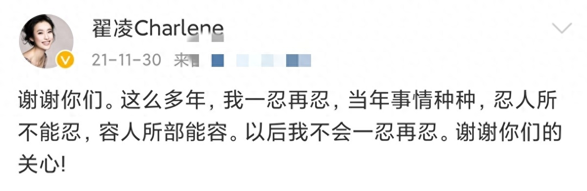 就在几个月前,翟凌在社交平台上发文称,当年忍人所不能忍、容人所不能容,以后我不会一忍再忍。