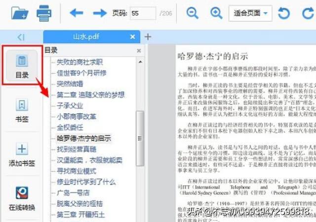 2.点击目录工具,就可以在边上看到pdf文件的目录了,点击对应的目录选项可以直接跳转到对应的章节。