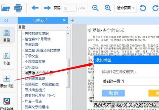 3.在pdf文件阅读到某个部分的时候,如果想要做个标记,以便下次继续阅读时,可以点击“添加书签”工具,在当前部分添加一个书签标记。已添加的书签可以在上面“书签”点击查看。