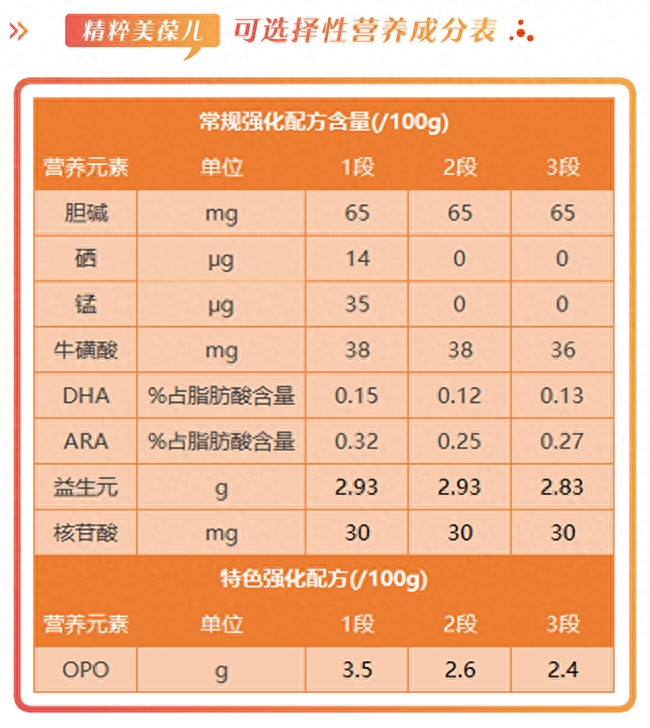 由表中可见,在常规强化配方上,精粹美葆儿整体添加的种类并不多,包括:胆碱、牛磺酸、DHA、ARA、益生元和核苷酸,其中益生元的添加量不错,各段添加量都在2.8g/100g以上,足量的益生元能够促进肠道有益菌的生长;但各段DHA的添加量并不高,都在0.2%以下,中国营养学专家组在《中国孕产妇及婴幼儿补充DHA的专家共识》中提到奶粉中DHA含量应为总脂肪酸的0.2%-0.5%,在这个范围内有益于婴幼儿早期神经和视觉功能发育。精粹美葆儿的特色强化配方比较简单,只添加了OPO,其中一段的添加量还不错,达到3.5g/100g,足量的OPO能够减少宝宝上火便秘的几率、促进脂肪酸和钙质的吸收、促进益生菌增殖。