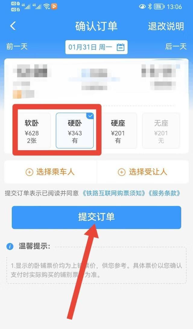 3.选择硬卧或软卧,再选择乘车人,点击提交订单,上下铺是自动分配的,如果分配到上铺,可以取消订单再次选择,注意不要超过三次。