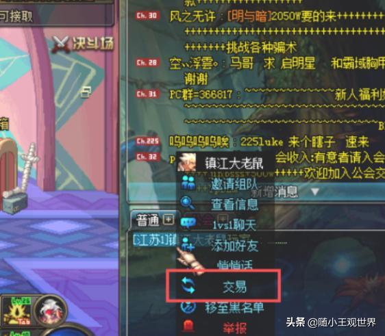 3.看喇叭收货方法:先发送悄悄话给他,可以和他谈谈价格。问他能不能便宜点卖给你。谈好价格之后,在聊天框那边点击他的ID选择频道跟踪,跟踪过去在点击ID选择交易。