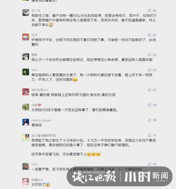 “真的吓死了,我听到有东西掉下来砸到树的声音,然后就砸到我家孩子头上了,孩子哇哇大哭,我看到地上有两个小金属罐,也不知道是做什么用的,警察现在也在查。还好孩子没事……高空抛物真的太危险了!”孩子奶奶说。