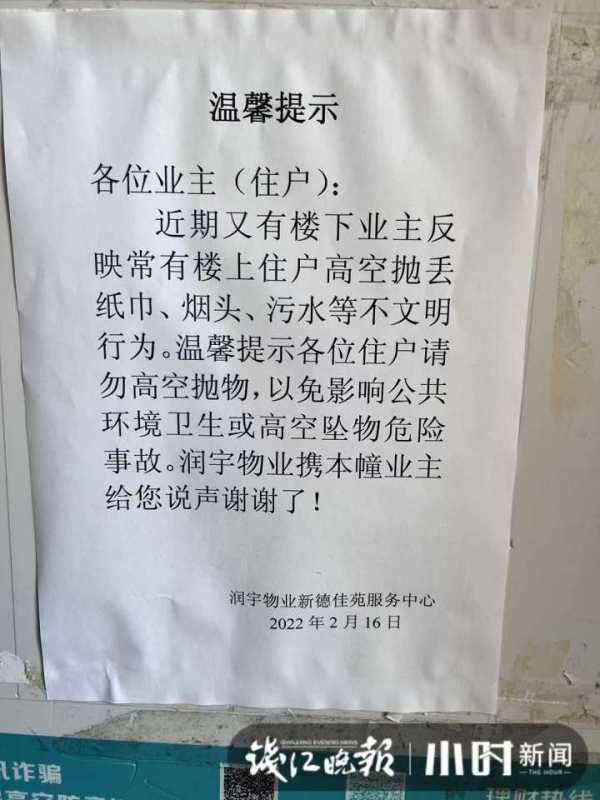 “新德佳苑小区是回迁安置房小区,不少房子都是出租的。确实有一些住户存在高空抛物的陋习,物业跟社区开会的时候也多次说过高空抛物的事情。在小区里,物业也进行了提醒,张贴过通知,但是高空抛物的情况依然存在。”