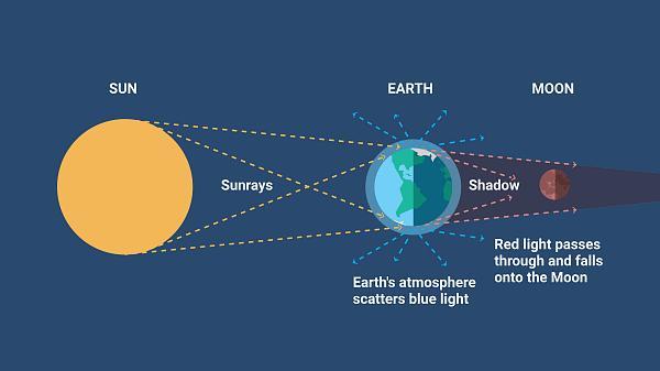 在月全食期间,月球可以呈现出不同的红色、橙色或金色,这取决于月食发生时地球大气层的情况。尘埃粒子、水滴、云和雾的数量都会对红色的色调产生影响。大气层中的火山灰和灰尘也会导致月球在日食期间颜色变得更黯淡。