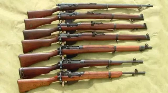 第1款:英SMLE步枪,这个名字可能比较陌生,换成“老李”是不是顺耳多了,李-恩菲尔德步枪。单发栓动步枪,全长1130毫米,重达8.8磅,使用7.7X56mmR步枪弹,射程1000码,初速738米/秒。此枪因为使用的弹药为7.7口径步枪弹,所以又被称为英七七(谷子地评论过)。它是英国联邦军队的象征,参战历史非常悠久,近百年的时间内,在非洲、阿富汗等多场战役都可以看到它。它的特点在于使用了独特的枪机设计,旋转后拉式!另外它还配备了该系列步枪普遍使用的盒式可拆卸弹匣,优点很明显,就是装弹快!凭借着这一优势,恩菲尔德步枪可以在战场上保持着持续的火力输出,甚至可以与机枪相提并论!