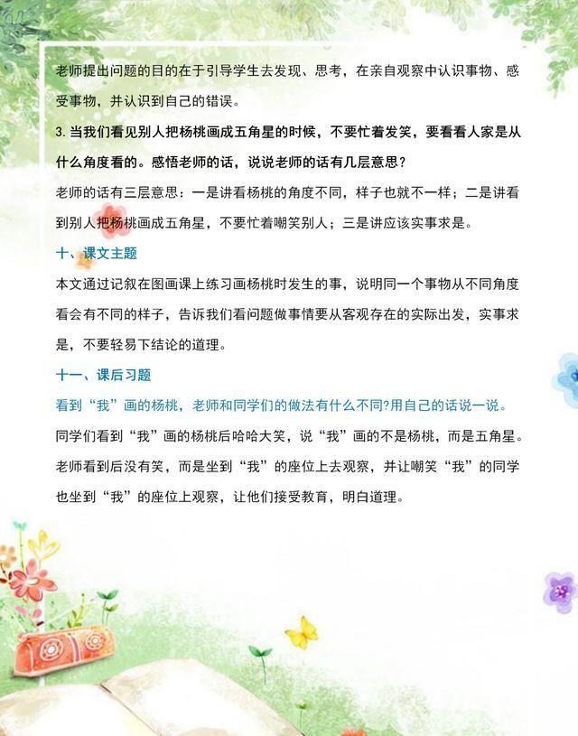 《画杨桃》这篇课文,主要记叙了“我”在画图课上,把杨桃画成了五角星的样子而遭到了同学的嘲笑。但在老师的教诲下,同学们认识到了自己的错误,告诉了我们“同一个事物从不同角度看会有不同的样子”的道理,教育我们党别人所说的、所做的跟我们不一样时,不要轻易下结论,而是应该站在别人的角度看问题。