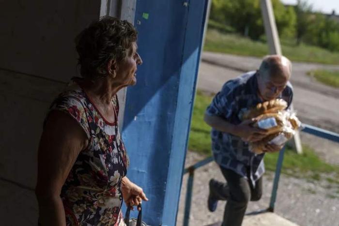 当地时间2022年8月27日,顿涅茨克地区,迪利夫卡的一家商店里,退休人员Vasyl Moiseienko(右)拿着新鲜的面包,一位老年居民正在等待他的快递。/视觉中国