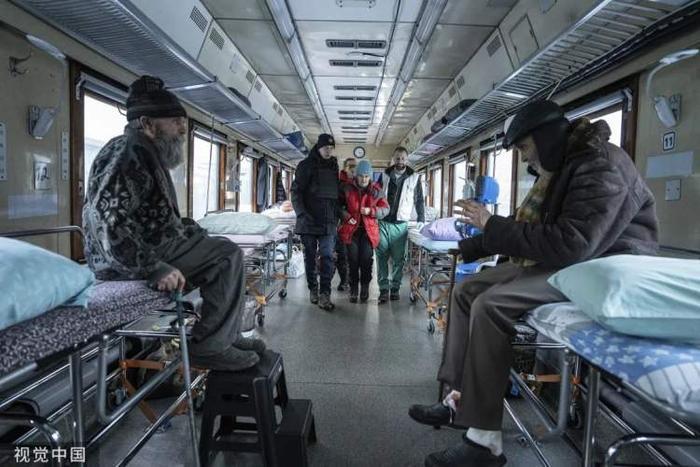 医生和救援人员帮助一名老年妇女在医疗列车上就座,该列车将患者从战斗前线附近疏散到更安全的地区。