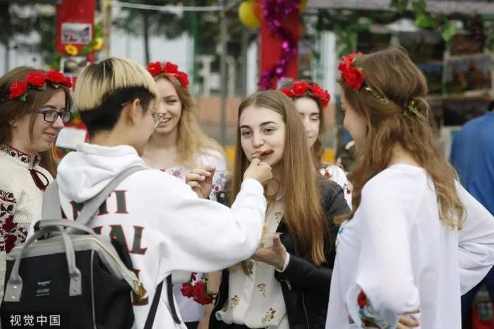 2019年6月13日,哈尔滨师范大学首届国际文化节启幕,图为留学生品尝乌克兰美食。