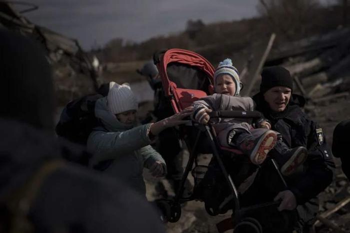 当地时间2022年3月9日,乌克兰基辅,民众逃离伊尔平,抬起婴儿车跨过一条小路。/视觉中国