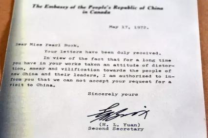 “亲爱的赛珍珠女士:来信收悉。考虑到长期以来您在著作里采取歪曲、攻击、谩骂新中国及其领-导-人的态度的事实,我被授权告诉您我们无法答应您访问中国的请求。您的忠诚的,二秘H. L. Yuan”