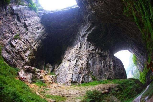 藏于原始森林和竹林中,天坑周围绝壁万丈,天坑下面是地洞。后坪天坑内汇聚了大量地理奇观,以阎王沟最为出名,全长达2300m、总深度约500m,高达160层楼,文如其名,谷底深切、气势逼人。