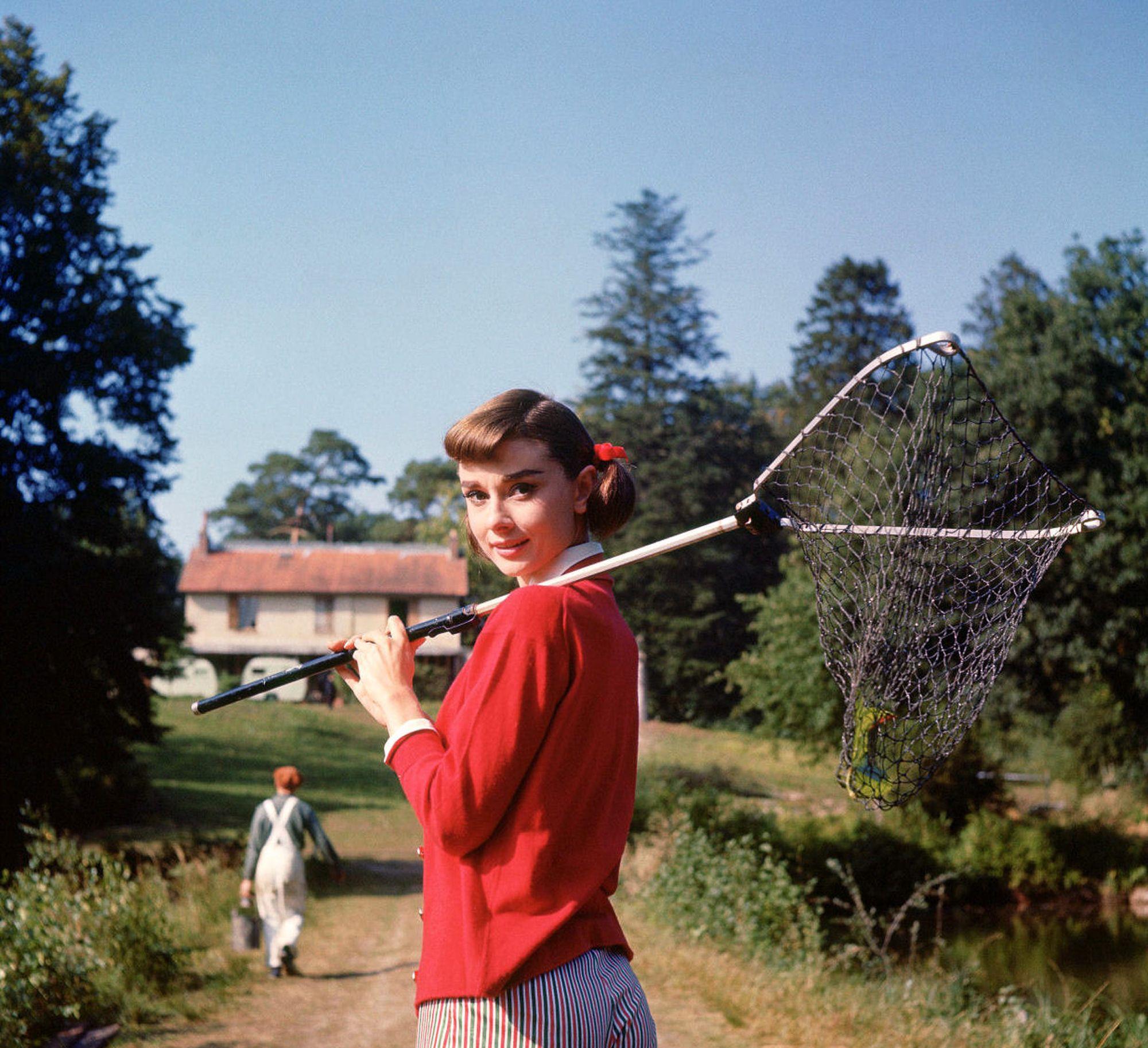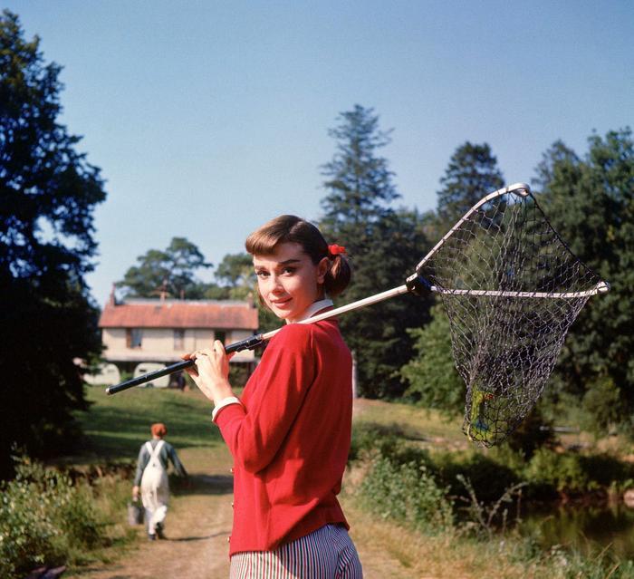 这是在一个农场里,赫本要去捕鱼,为了让自己符合农村小妹捕鱼的形象,赫本的穿戴和配饰也都像一个是在农场长大的姑娘。