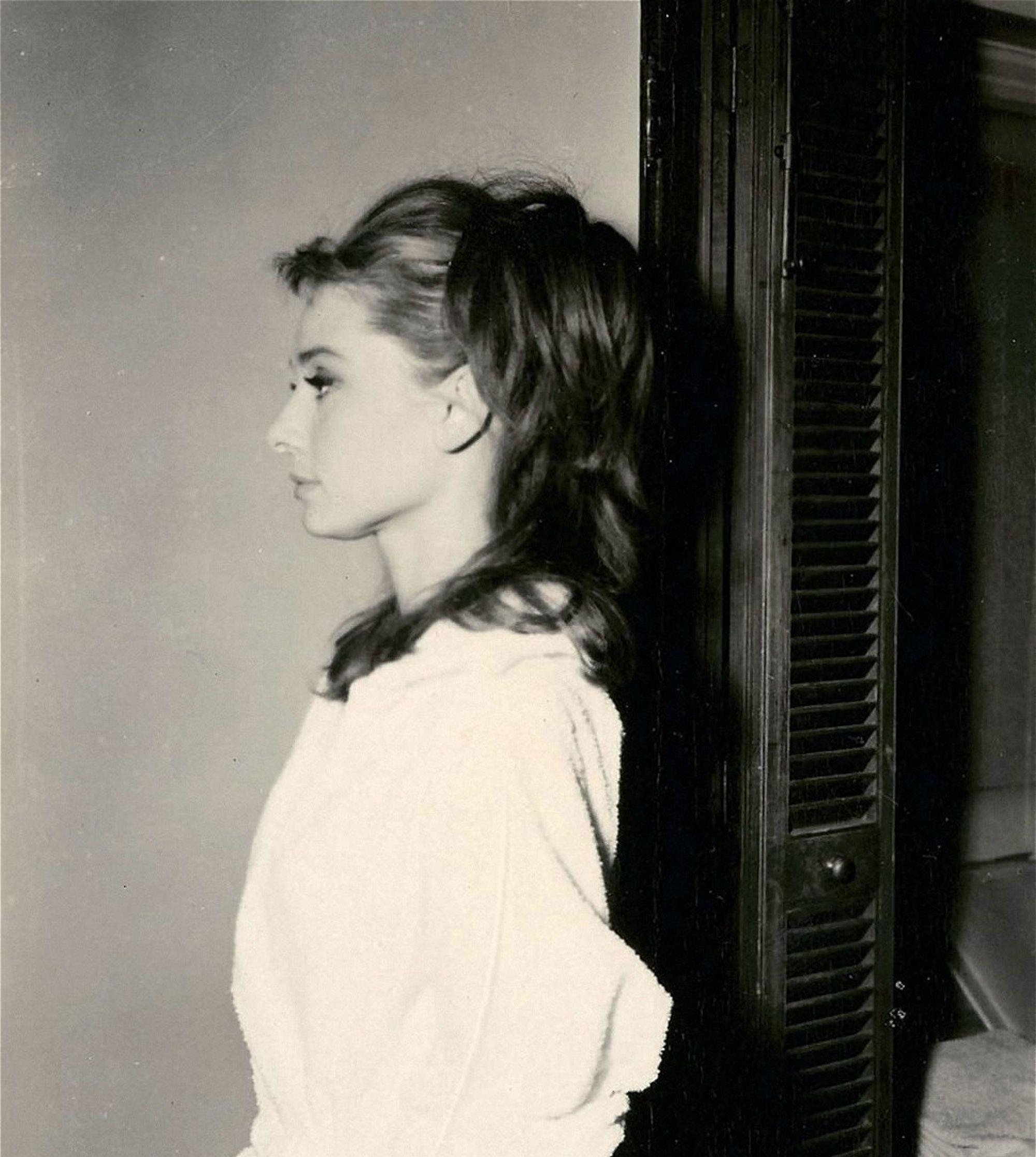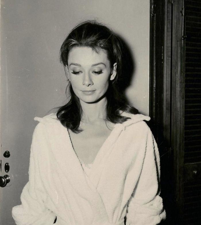 穿着白色的浴袍,留过肩的中长发,双手在两侧耷拉着,赫本微微低头,眼睛看着地上,两只眼睫毛格外的长,还很黑,精致的小鼻子,嘴角微微上扬,即使没有化妆,也依旧好看