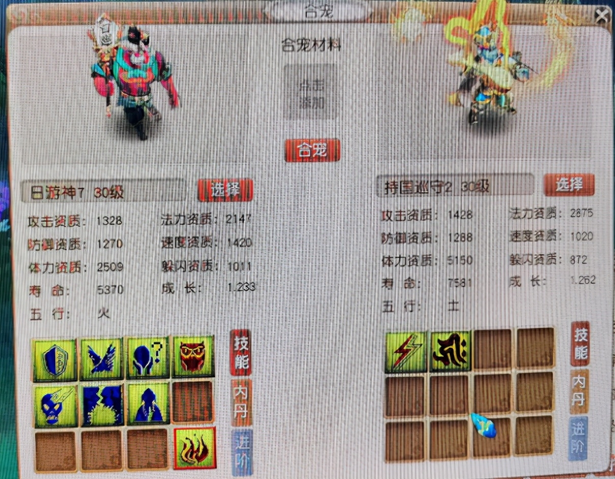 上面这组炼妖用的是一只七技能的日游神和一只两技能的持国巡守,在技能数量的差距上是比较大的,但是这两只召唤兽的价值差距却不大,日游神已经打掉了三个必带的召唤兽技能,这样合出来的召唤兽造型如果是日游神,技能的数量上限能够达到12个,合出来的召唤兽造型如果是持国巡守,技能的数量最多只能达到九个。