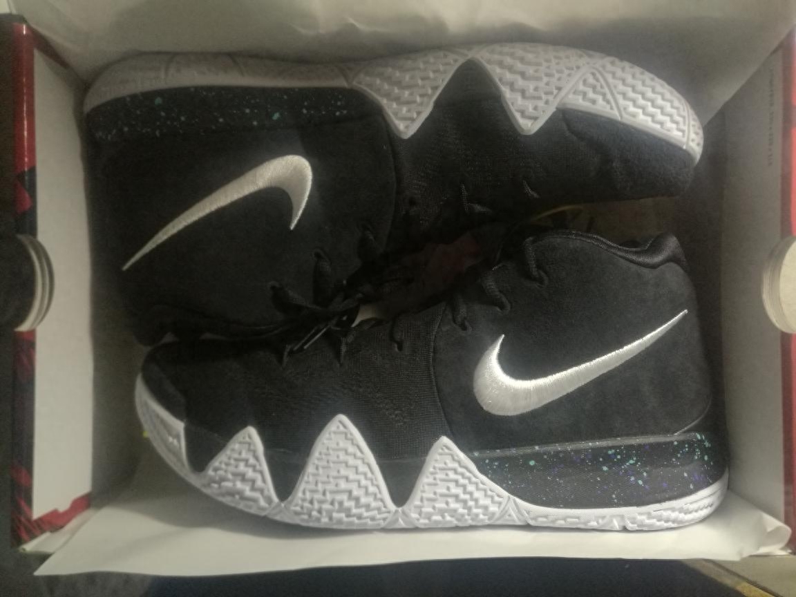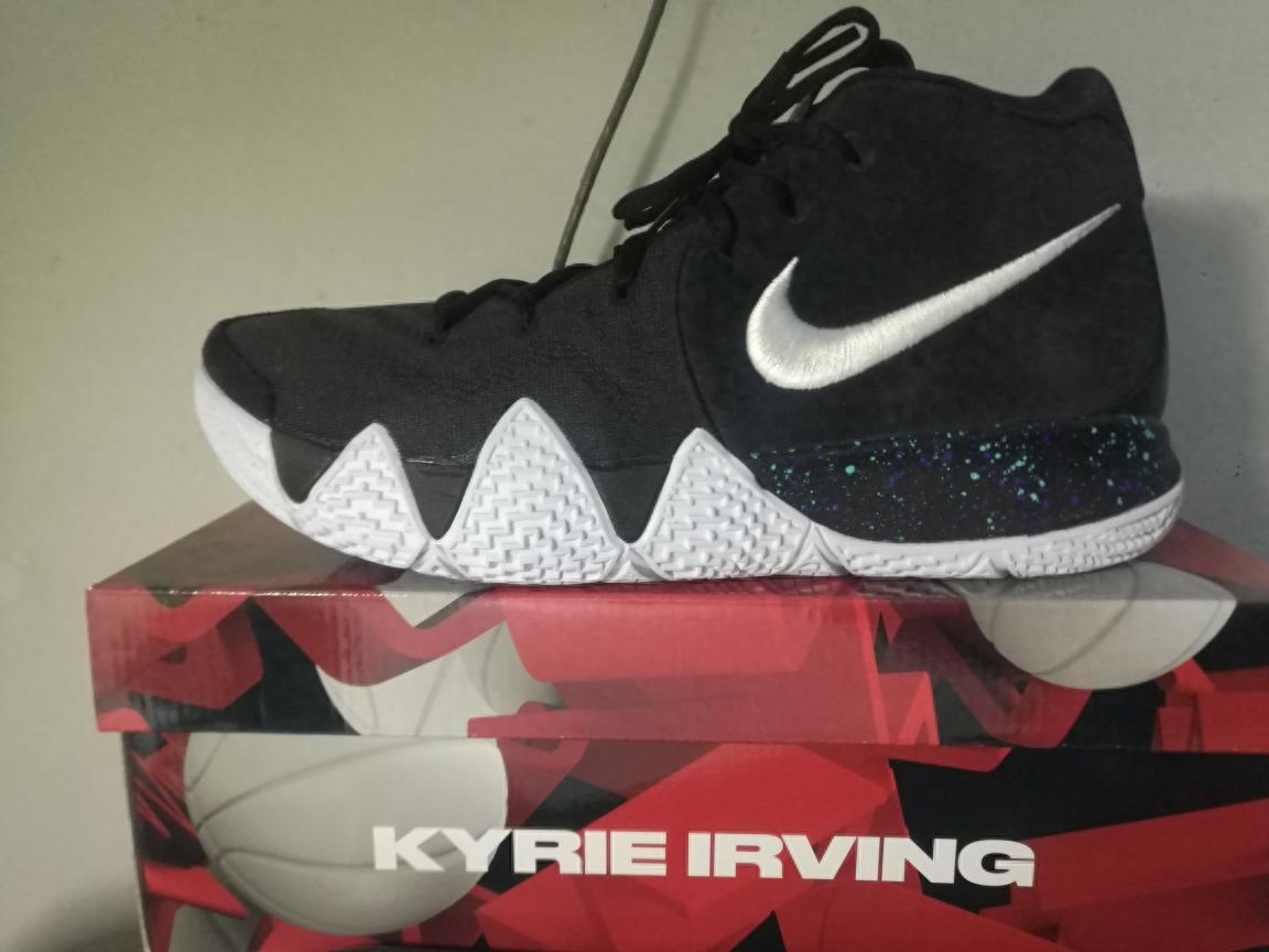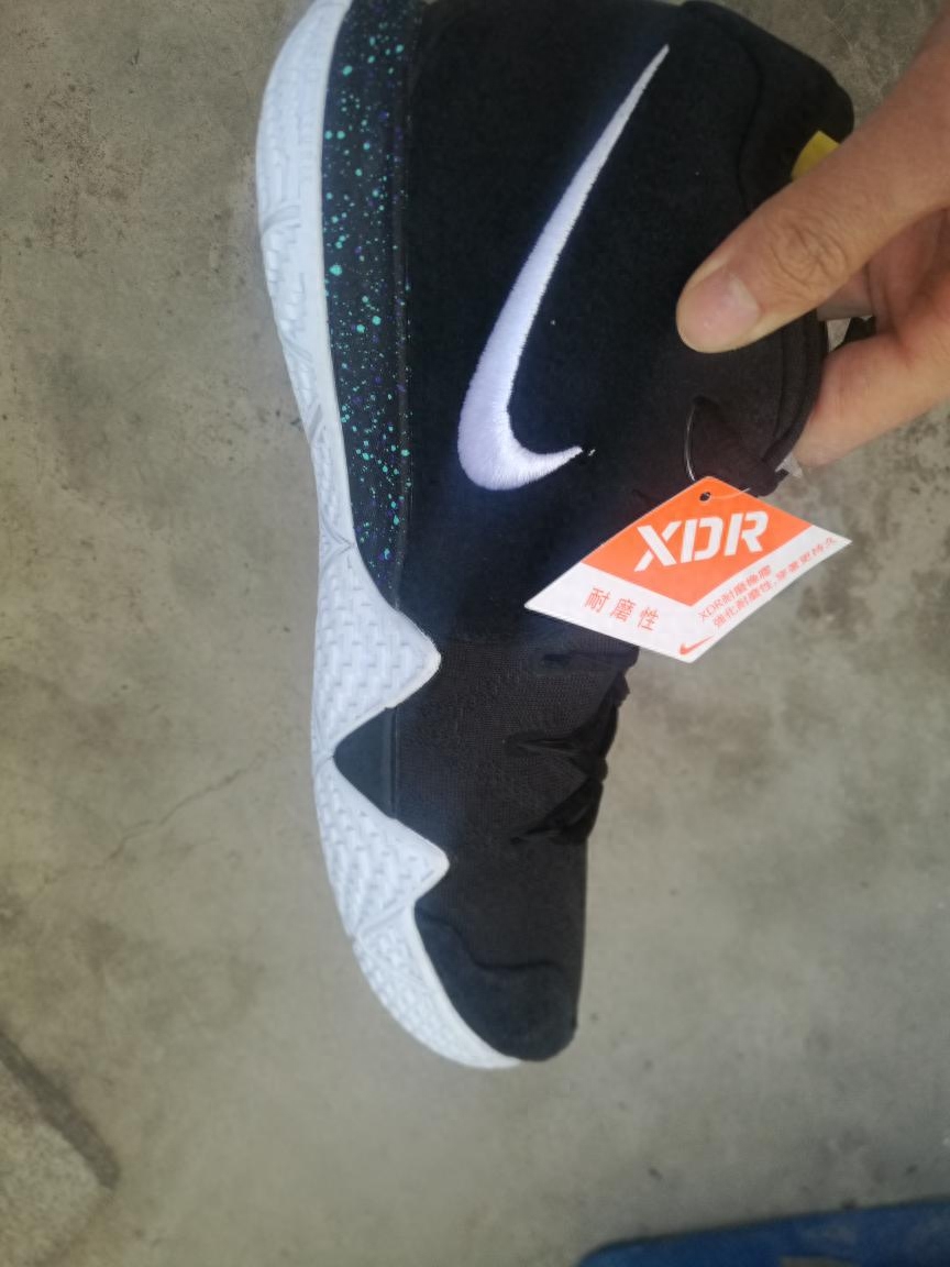 外形总体来说比较一般,不能说难看,但也不够好看.看不出设计的用心程度.好歹三代还有点设计感,到了四代反而吃起了老底,设计大部分照搬前几代。并且由于鞋型的问题,显得特别厚重,东北大棉鞋既视感。材料上前掌mesh网面,织物下面好像还有一层塑料盖住了,感觉也不会特别透气。脚趾处的防护部分没有采用热熔材料,选择和后掌样的翻毛皮材质。并且配上了刺绣的swoosh。鞋带应该是棉质的,但是这次的鞋带有些短。鞋后跟和鞋舌上的Kyrie logo提拉带应该是人造革材质。算是在三代的基础上进行了材料升级。后跟加固tpu,中底里也常规配置一块中足康扭转tpu。中底使用科比和保罗鞋款用过的cushion缓震材料,并且加大了zoom气垫的体积,对于前三代又是一次升级,在鞋底上,使用了xdr,应该能适应外场,但是纹路也不是多深,估计水泥地还是一般吧,塑胶场地还可以。再有就是一些小的细节,比如,鞋带孔有热熔材料覆盖,前掌两根装饰飞线,后跟开窗zoom下面应该是有一层塑料片阻挡,防止损坏。刺绣的swoosh很有质感,紫绿色外底泼墨。各种欧文细节h+h, jby,球衣号码11号,还有新加入进来印压在鞋舌提拉带后面的all seeing eye,最后在鞋头最前面纹路下面有特殊的纹路,不知道什么意思,希望得到解释。总体来说细节很多。