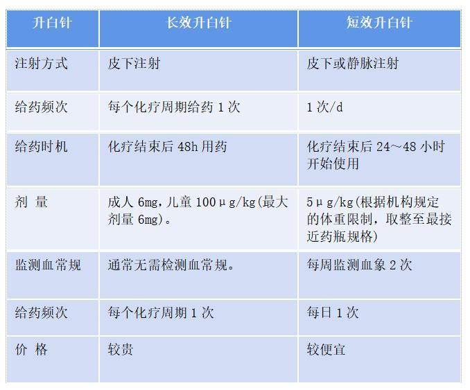 “长效升白针”与“短效升白针”药物作用及治疗疾病类型基本相同,不过它们还是有所区别,应根据不同情况选择使用,区别如下: