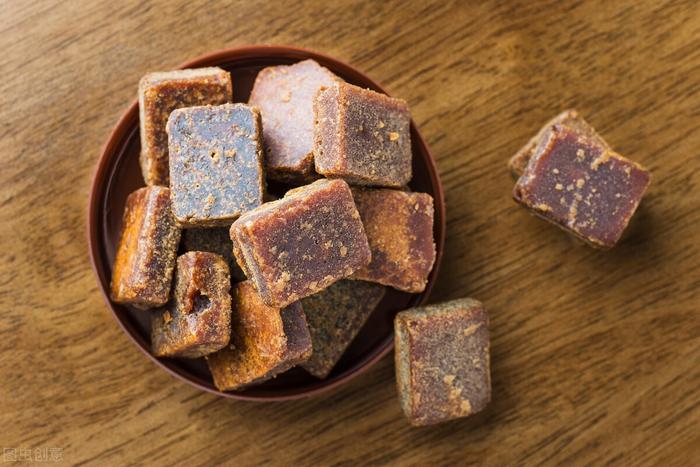 真红糖,小块,有明显的沙纹,暗红色或深棕色,表面有冷藏凝固留下的气孔。激光切割非常容易,沸水中气泡多,因为不加所有防腐剂融化速度慢,闻起来香醇,尝起来香甜可口。