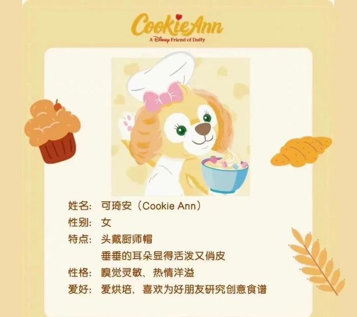 可琦安(CookieAnn)是一只黄色的小狗厨师,她长着松软的长耳朵,头戴厨师帽,还拥有敏锐嗅觉,热爱美食,喜欢发明创意食谱,有天达菲准备吃棉花糖,正好撞到了端着华夫饼的可琦安,可琦安接住了华夫饼,还发明了一种新的事物——棉花糖华夫饼,达菲非常喜欢,欢欢喜喜地交了这个新朋友。