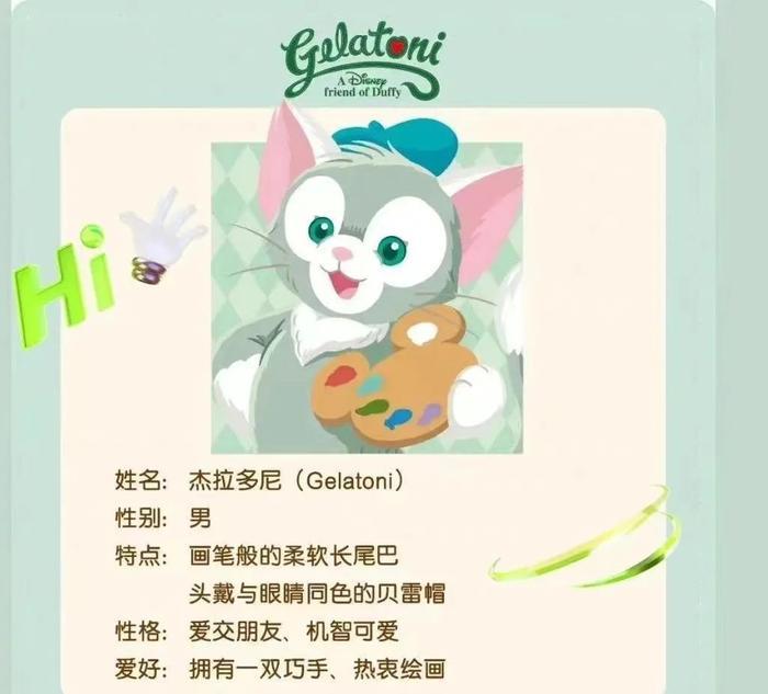 接着,达菲和雪莉玫在环球旅行时途径意大利,认识了猫画家杰拉多尼(Gelatoni),这只绿色的猫猫头戴贝雷帽,喜爱绘画,当达菲不小心洒落了手中的冰淇淋,杰拉多尼巧妙地将他的尾巴沾起掉在地上的冰淇淋作了一幅画,让达菲破涕为笑,两人从此成为了好朋友。
