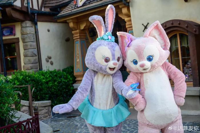 除了玲娜贝儿与游客的互动,达菲家族的玩偶们之间也开始了联动。迪士尼前顶流女明星星黛露也和玲娜贝儿频频同框。