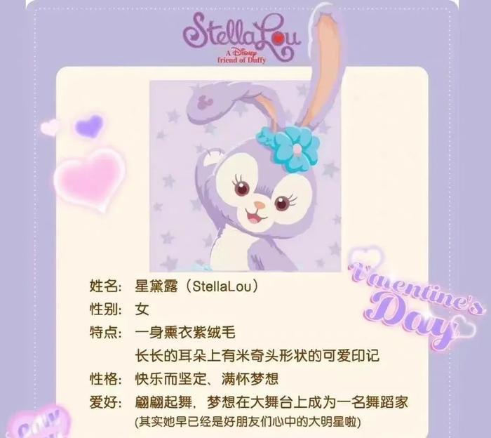 颇具人气的星黛露(StellaLou)在迪士尼里,是一只会跳舞的紫色兔子,文艺又淑女,她和达菲偶遇后相见恨晚,还和达菲分享了自己的梦想——成为百老汇舞蹈家。达菲鼓励星黛露勇敢追梦,星黛露也随之成为达菲的好朋友。