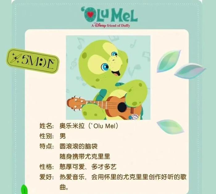 小海龟奥乐米拉(OluMel)则来自太平洋的夏威夷,热爱音乐,随身携带尤克里里,达菲和米奇为雪莉玫寻找生日礼物的途中,被奥乐米拉用尤克里里创作的美妙旋律吸引到一个港湾,在那里遇见了绿色的小海龟奥乐米拉,便成为了朋友。