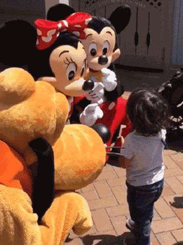 就像米奇和米妮发现一位聋哑小朋友时,弯下腰用手语和他交流。