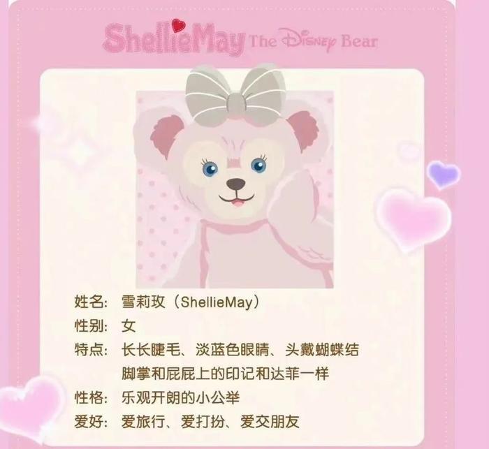 为了让达菲不孤单,米妮又做了一只熊送给他,这只熊就是雪莉玫(ShellieMay),雪莉玫有着长长的睫毛,淡蓝色的眼睛,头戴蝴蝶结,脚掌和屁屁上的印迹都和达菲一模一样,因为两只熊长得很像,颜色也很搭,有不少人误以为两个小熊是情侣,其实两小只在迪士尼的官宣里只是好朋友而已啦。