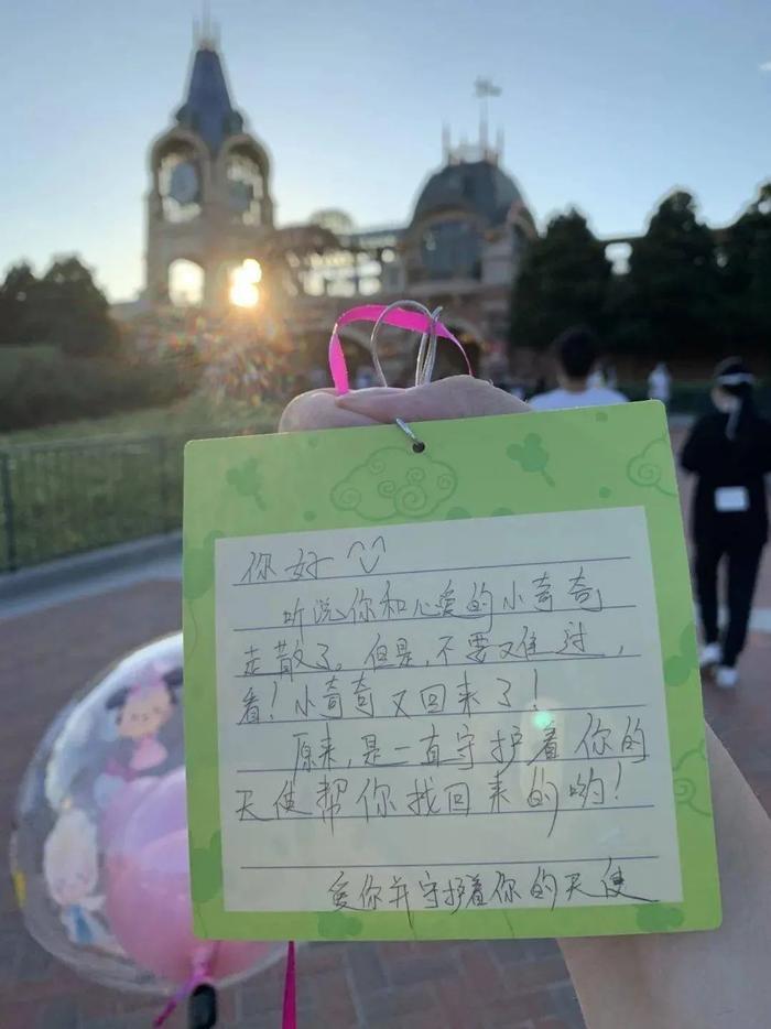 当时这位爸爸带女儿去上海迪士尼乐园玩时,女儿把形影不离的玩偶弄丢了,难过极了。为了不让女儿的童年留有遗憾,这位爸爸给女儿重新买了个一模一样的玩偶,并且根据过往的照片,把这个玩偶进行“做旧”处理,为了让女儿相信这就是她弄丢的那一个,这位爸爸把玩偶放回迪士尼失物招领处,请迪士尼工作人员帮忙“演戏”,接着带上女儿假装回去找丢失的玩偶,迪士尼的工作人非常配合地完成了这位爸爸善意的谎言,还给女孩留下了字条。