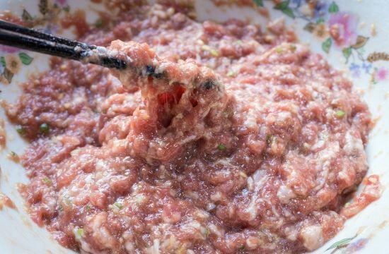 然后给肉馅里加食盐、生抽、老抽、胡椒粉,搅拌均匀,出现黏性就可以停下来。再加一些花椒水,不要一次倒太多,可以分好几次加进肉馅里,搅拌到吸收掉就好。