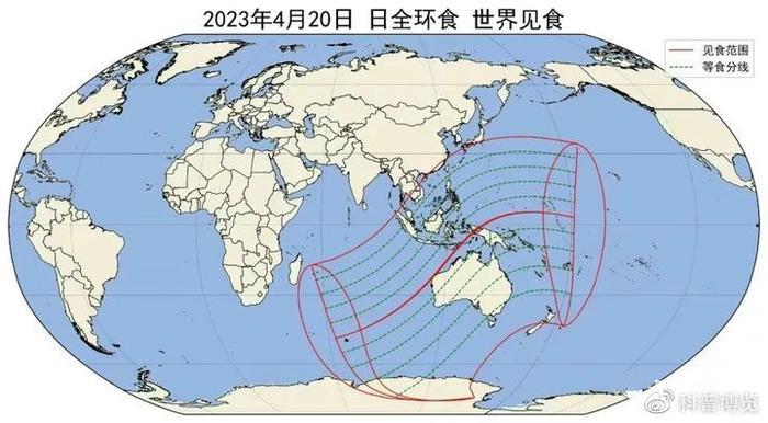 而且这次日食在地球上的可观测范围很大,全环食带从印度洋西南部开始,向东北经过印度洋东部,再向东走向印度尼西亚东部,直到太平洋中西部才结束。所以在印度洋南部、亚洲东南部、大洋洲东南部之外的大部分、太平洋西部、都可以看到。就连南极洲的部分区域都可以看到日偏食。