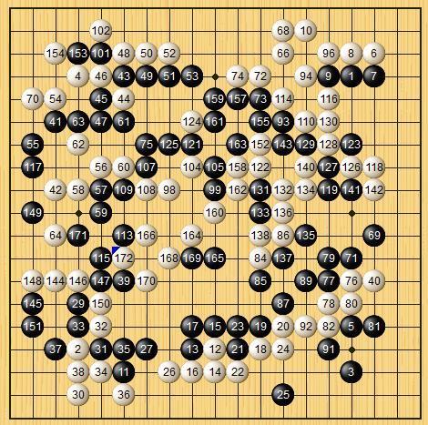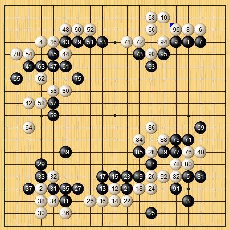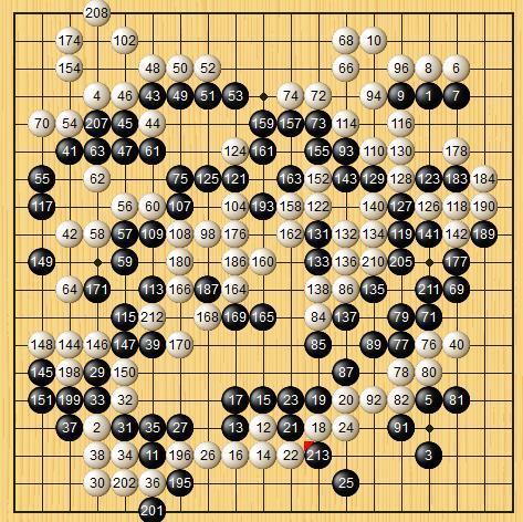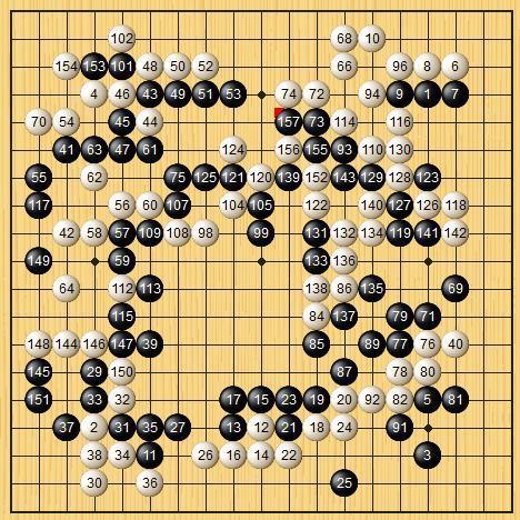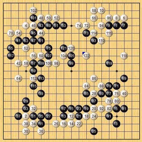 白棋破掉了中腹大空,同时还吃掉了右上角的黑棋。以此为代价,左边的白棋全部成了黑棋的盘中餐。