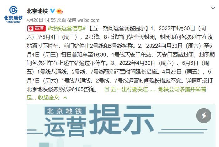 3、2022年4月30日(周六)、5月6日(周五)1号线八通线、2号线、7号线取消运营时间延长措施。4月29日(周五)、5月7日(周六)1号线八通线、2号线、7号线运营时间延长措施不变。