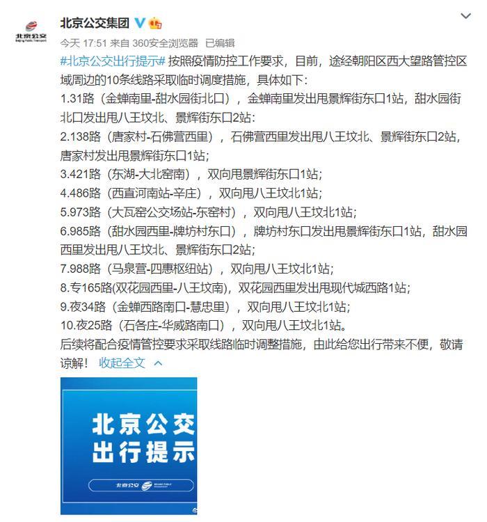 按照疫情防控工作要求,目前,途经朝阳区西大望路管控区域周边的10条线路采取临时调度措施,具体如下:1.31路(金蝉南里-甜水园街北口),金蝉南里发出甩景辉街东口1站,甜水园街北口发出甩八王坟北、景辉街东口2站:2.138路(唐家村-石佛营西里),石佛营西里发出甩八王坟北、景辉街东口2站,唐家村发出甩景辉街东口1站;3.421路(东湖-大北窑南),双向甩景辉街东口1站;4.486路(西直河南站-辛庄),双向甩八王坟北1站;5.973路(大瓦窑公交场站-东窑村),双向甩八王坟北1站;6.985路(甜水园西里-牌坊村东口),牌坊村东口发出甩景辉街东口1站,甜水园西里发出甩八王坟北、景辉街东口2站;7.988路(马泉营-四惠枢纽站),双向甩八王坟北1站;8.专165路(双花园西里-八王坟南),双花园西里发出甩现代城西路1站;9.夜34路(金蝉西路南口-慧忠里),双向甩八王坟北1站;10.夜25路(石各庄-华威路南口),双向甩八王坟北1站。后续将配合疫情管控要求采取线路临时调整措施。