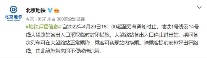 今天下午6点起至另有通知时止,地铁1号线及14号线大望路站各出入口采取临时封闭措施,大望路站各出入口停止进出站。期间各次列车可在大望路站正常乘降,乘客可实现站内换乘。请乘客提前安排好出行路线。