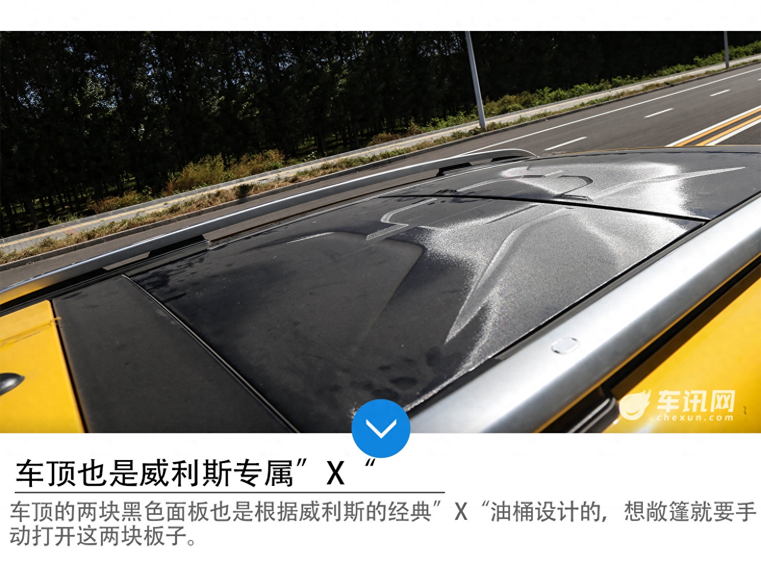 独特的Jeep经典元素在这台自由侠敞篷版被更个性化了许多,圆灯和经典的7孔进气格栅看着不再那么严肃反而更加的卡哇伊,车顶、尾灯都采用了根据二战时期威利斯后挂油桶设计的X造型元素,风挡玻璃角是落处更印有的威利斯剪影。