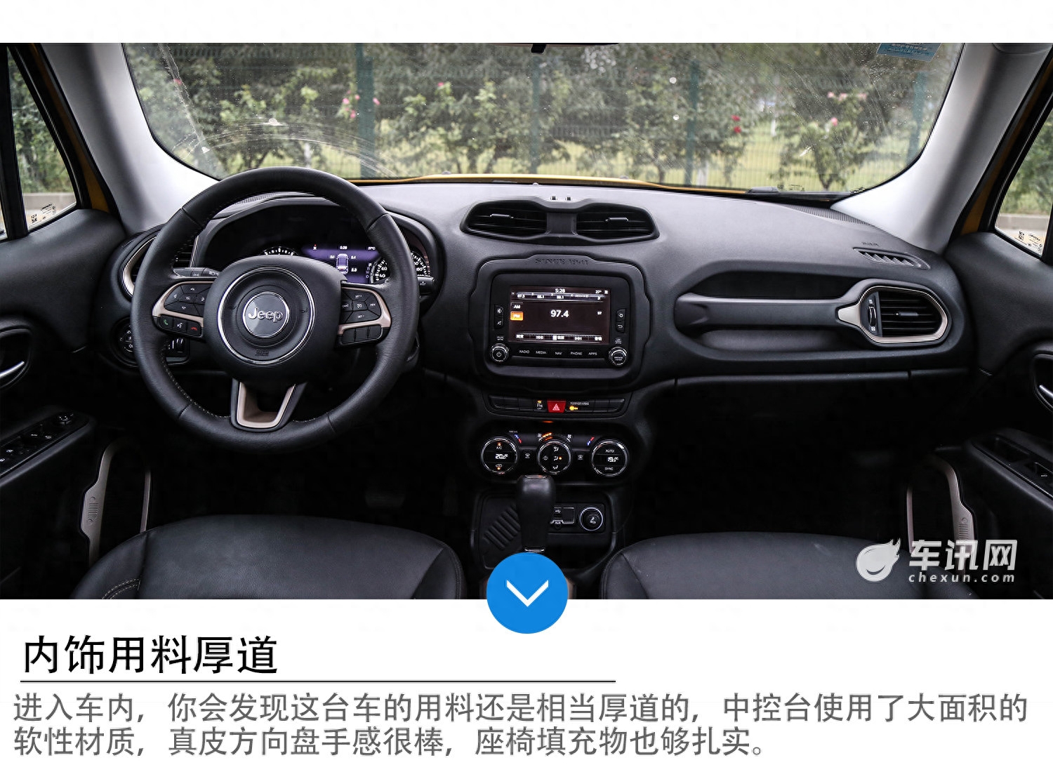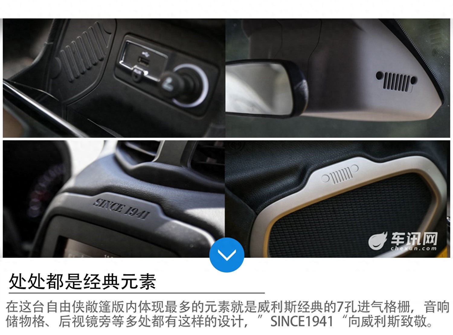 同外观一样,车辆的内饰设计也充满了时尚与个性。Jeep的经典元素更是多的数不胜数,设计的位置也很巧妙,中控台上的SINCE1941向鼻祖威利斯致敬,音响,储物格,后视镜后方等地方都巧妙地吧七孔进气格栅的元素融入其中。