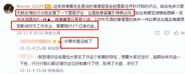 除了站队评论外,有网友抓住了前妻控诉文的另一个重点。在前妻微博里,她提到真实的离婚原因会让黄景瑜失业,也就是相当于退圈。网友认为前妻5个月前的微博,共同表达过和平分手的意愿,坚称网上内容都是造谣,但又引导大家猜测离婚原因,用心险恶。