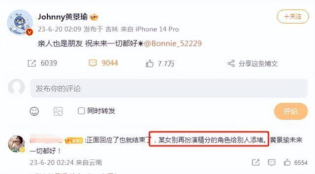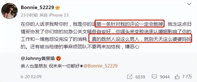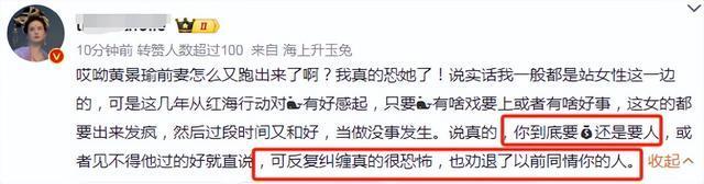 接着,前妻又转发黄景瑜承认两人有过婚姻关系的微博大肆吐槽。王雨馨称假若是她的话,会把官宣分手评论的第一条恶评删除。
