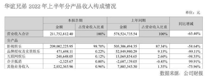 期间,华谊兄弟各业务收入还频现下降趋势,并且,该趋势在进入2022年后似乎有所加大。2022年上半年,该公司影视娱乐、品牌授权及实景娱乐、互联网娱乐三大业务收入同比分别下降58.64%、99.11%和98.35%。