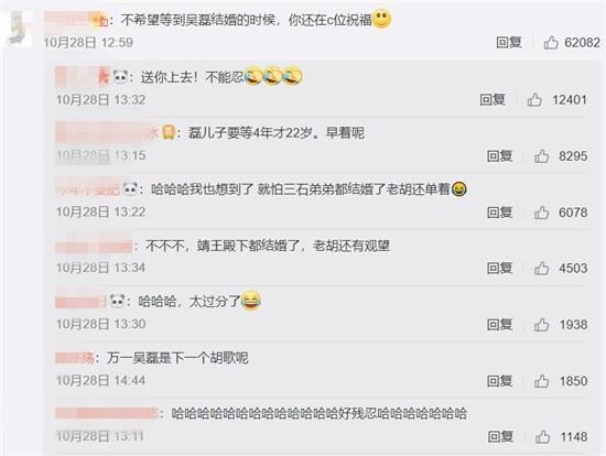 每一次娱乐圈有人结婚,胡歌这样的黄金单身汉都会被来一波催婚。粉丝虽然给胡歌的底线是不想看着小他17岁的吴磊感情走在他前面,只是感情这个东西确定很难说,等哪天胡歌真的再对吴磊还要“C位祝福”的时候,怕是粉丝对催婚可能都会疲劳的吧!