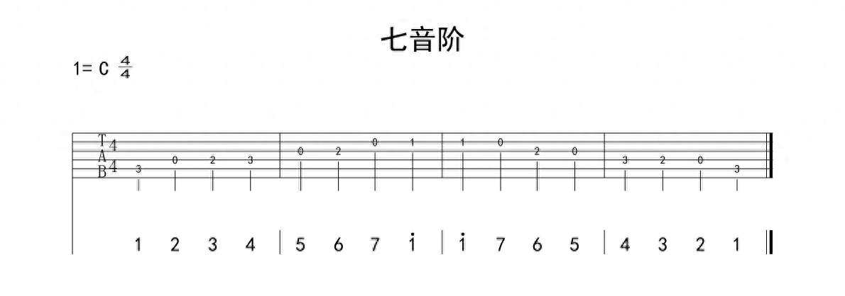 今天给同学们介绍一种基本功的练习方式:七音阶。那么什么是七音阶呢?以C大调为例,七音阶即为C大调的7个自然音阶,也就是我们熟悉的:do、re、mi、 fa、 sol、la、 si、 do。七音阶练习,也就是用吉他弹奏1、2、3、4、5、6、7。如图:
