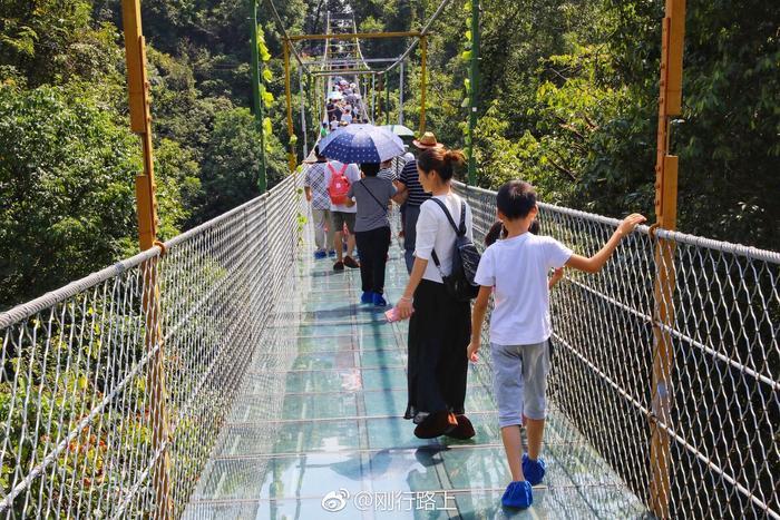 在融水双龙沟景区感受广西第一条悬索玻璃桥,这里总长199.9米,高52