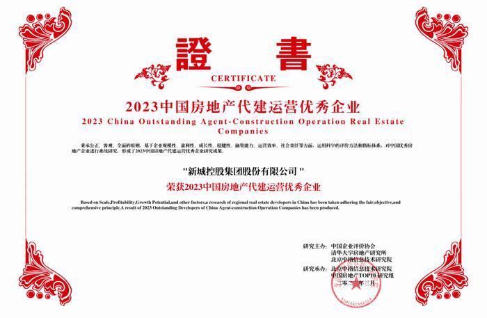 2023年3月16日,由中国企业评价协会、清华大学房地产研究所、北京中指信息技术研究院主办,北京中指信息技术研究院中国房地产TOP10研究组承办的“2023中国房地产百强企业研究成果发布会暨第二十届中国房地产百强企业家论坛”在北京隆重召开。新城控股集团凭借着过硬的专业实力及领先的业务成绩,荣膺“2023中国房地产代建运营优秀企业”,彰显专业稳健的综合实力。