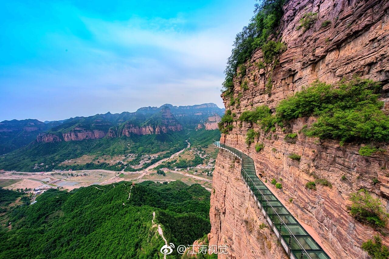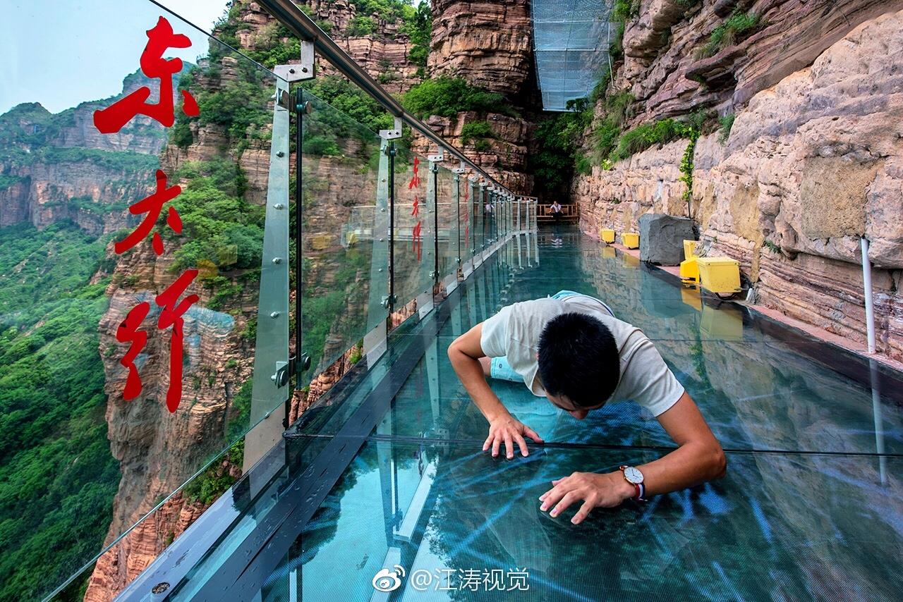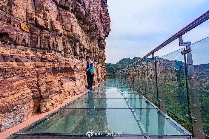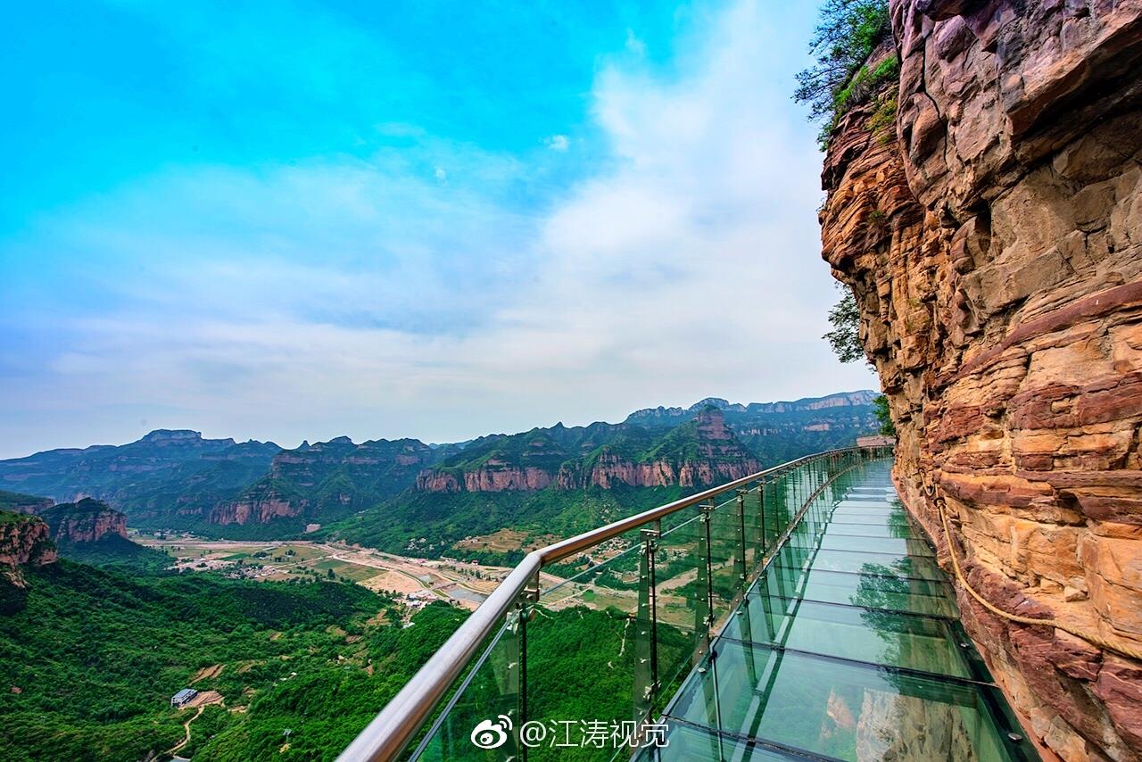 东太行景区266米的玻璃栈道围绕山体建在千米高的龙头崖上腰处,走在上面,脚下就是悬崖峭壁、万丈深渊,最为惊险刺激的是你走到哪,还伴有玻璃碎裂的“咔嚓”声特效。这种全身颤抖,心跳加快的感觉,你想不想体验一下?@东太行 @同程验客