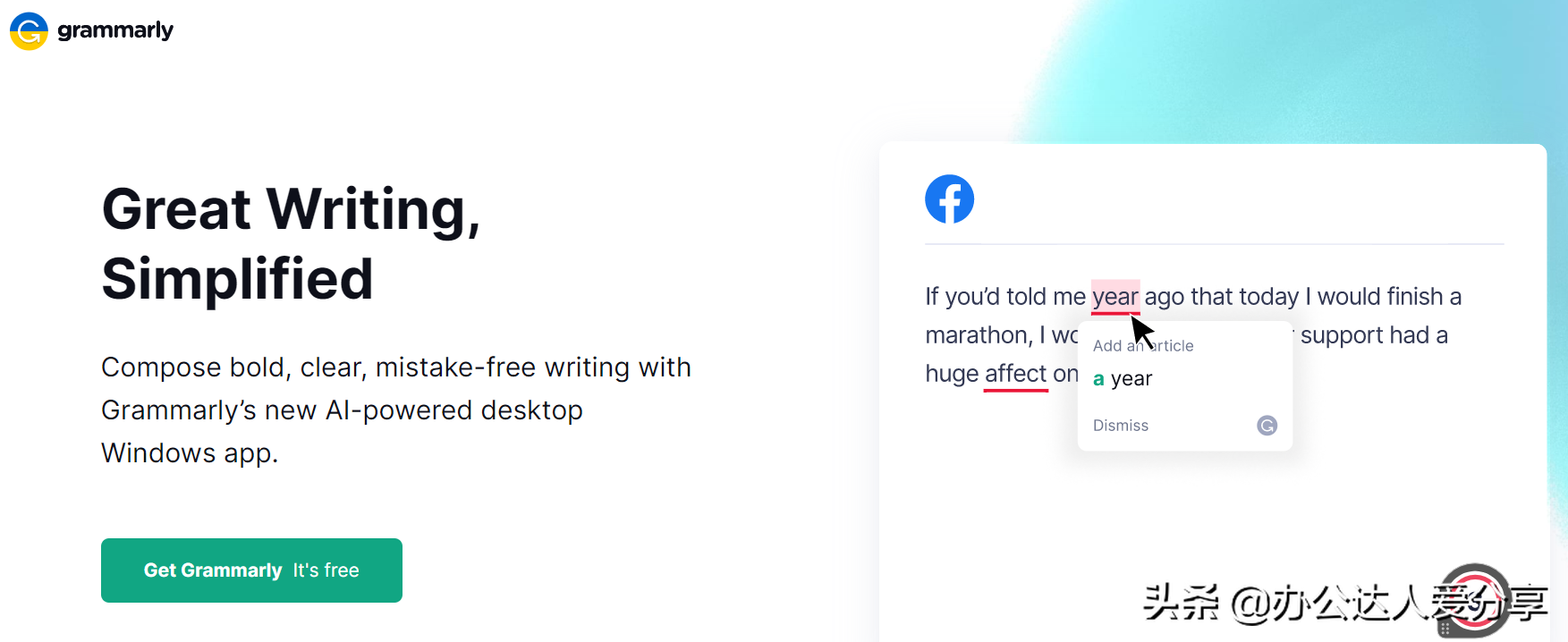 免费在线写作助手,使用Grammarly的全新AI驱动的桌面,你可以在Windows 应用程序上大胆、清晰、无错误的写作。