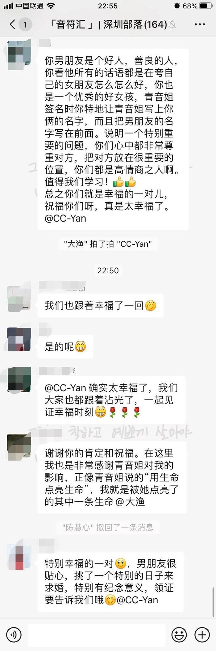 分享会结束后,他们在群里恭喜求婚成功的小伙伴: